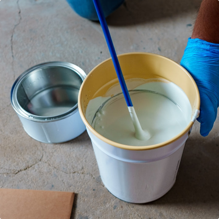 Component van de coating eerst goed oproeren tot een homogene massa, vervolgens component bij component A gieten. Gedurende 1 minuut mengen met een mengspiraal in een boormachine tot een homogene massa ontstaat. Omtoppen: Giet een deel van het gemengde product nog even in het blik van het B-component, roer door en giet weer terug bij het A-component. In zijn geheel nogmaals een minuut doormengen met de mengspiraal.